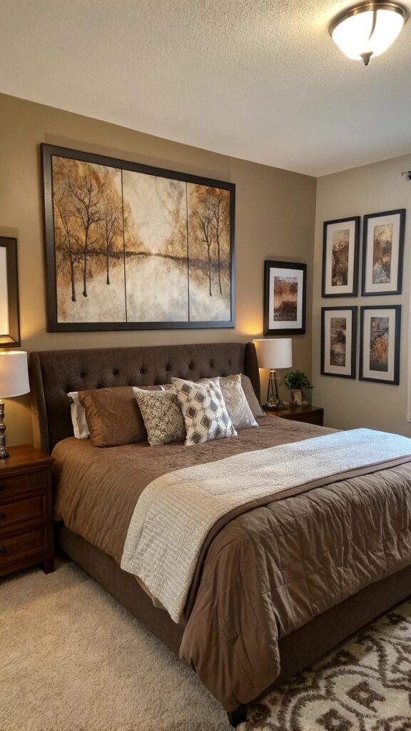 Ensure artwork is hung at the appropriate height. It adds personality and visual interest to the walls. Wall decor completes the aesthetic of your brown bedroom.