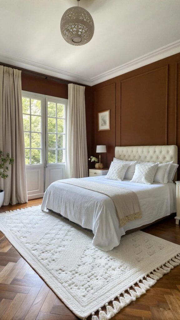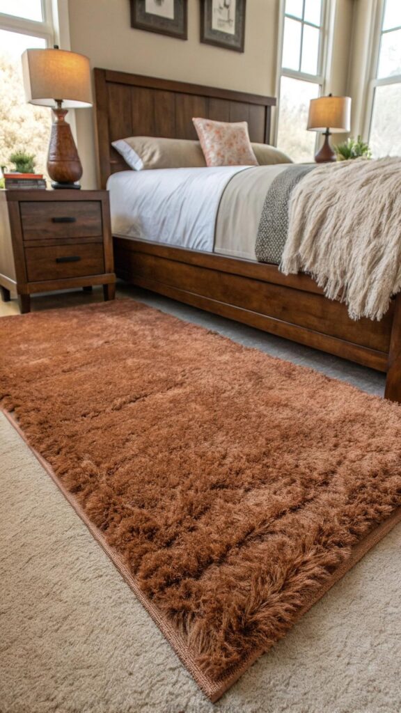 A plush area rug adds warmth, comfort, and defines the space in a brown bedroom. Choose a rug in a complementary shade of brown or a contrasting color. A soft, high-pile rug feels luxurious underfoot.
