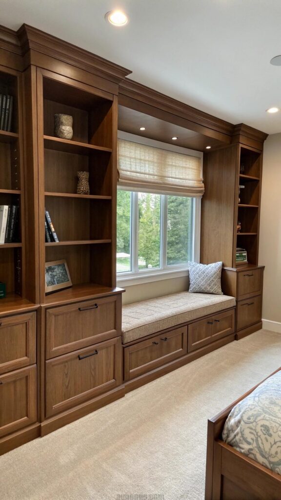 Consider built-in bookshelves around the bed or a window seat with storage. These solutions provide practical functionality. They create a streamlined and tidy appearance.