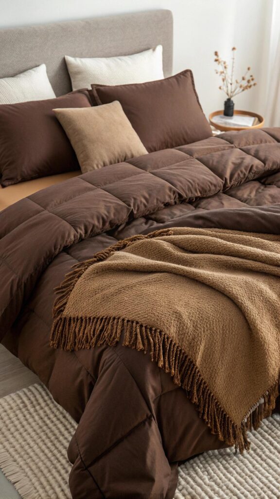 Consider a chocolate brown duvet cover with lighter brown throw pillows. A textured brown blanket can add visual interest. This creates an inviting and comfortable sleeping space.
