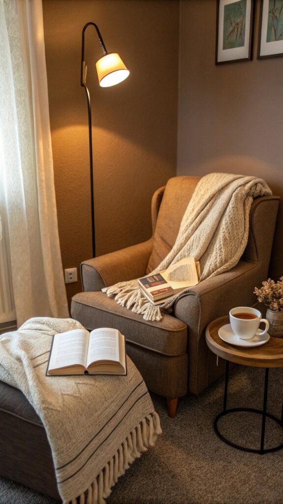 Ensure adequate lighting with a floor lamp or a wall-mounted reading light. A small side table can hold books and a cup of tea. This creates a dedicated space for unwinding.
