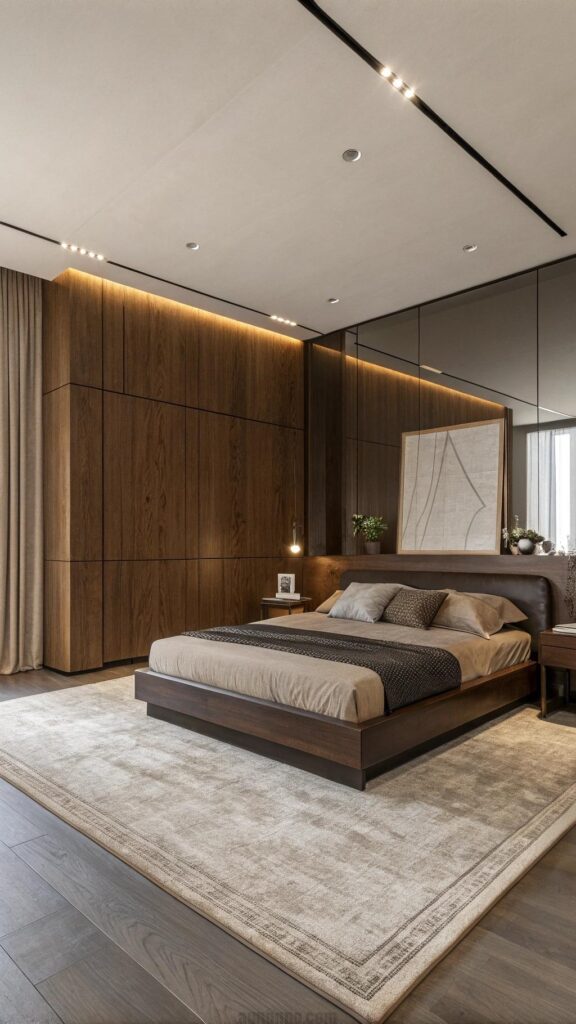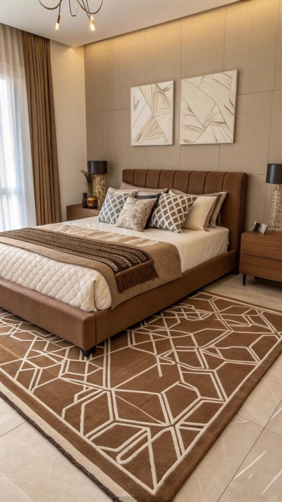 Geometric patterns add a contemporary edge to brown bedroom designs. Incorporate patterns through rugs, throw pillows, or artwork. Choose subtle patterns for a sophisticated look.