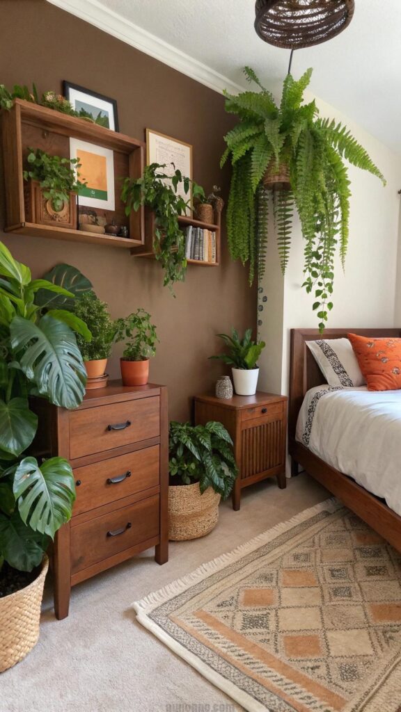 Choose plants that thrive in indoor environments. Place potted plants on nightstands, dressers, or shelves. A large floor plant can be a striking focal point.