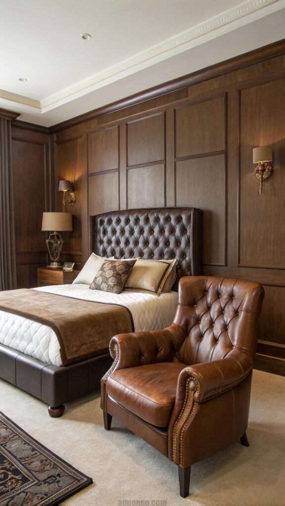Leather accents add a touch of luxury and texture to brown bedrooms. A leather headboard or armchair can be a sophisticated addition. Choose rich, supple leather for a high-end feel.