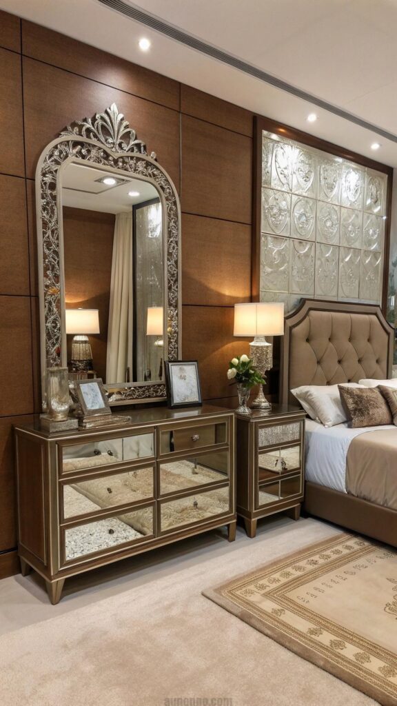 Consider a mirrored dresser or nightstands for a sophisticated look. These accents create a sense of openness. They also add a contemporary edge to the design.