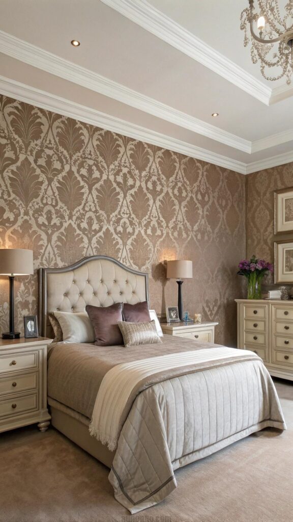 Patterned brown wallpaper adds depth and visual interest to your bedroom. Choose subtle patterns for a sophisticated look. Bold patterns can create a dramatic statement.