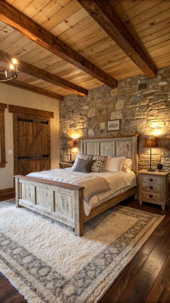 Create a rustic brown bedroom with natural materials and earthy textures. Exposed wooden beams add architectural interest. Stone accents can enhance the natural aesthetic.