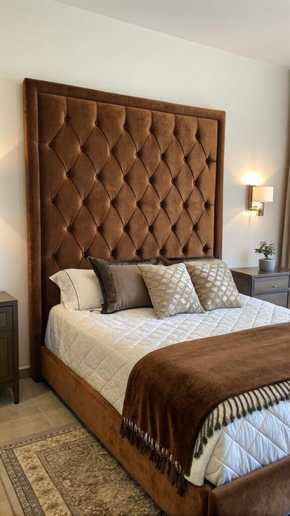 A statement headboard can be the focal point of your brown bedroom. Choose a headboard with unique texture, material, or design. An upholstered headboard in a rich brown fabric adds luxury.
