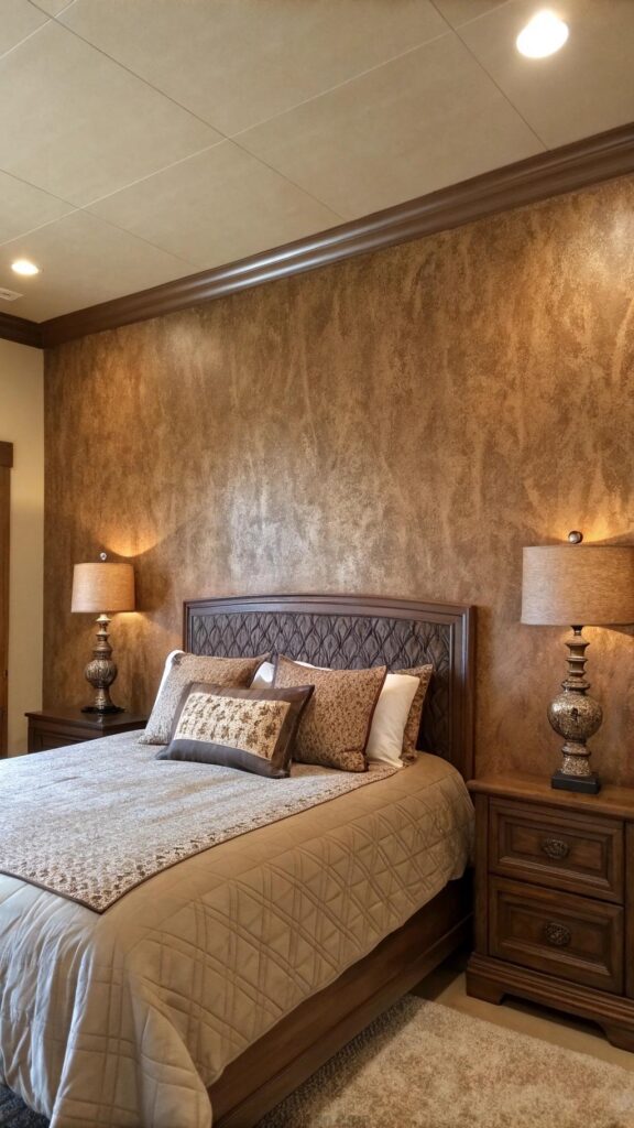 Textured walls add depth and interest to brown bedrooms. Consider a Venetian plaster finish for a subtle, sophisticated look. A brick or stone accent wall can create a rustic feel.