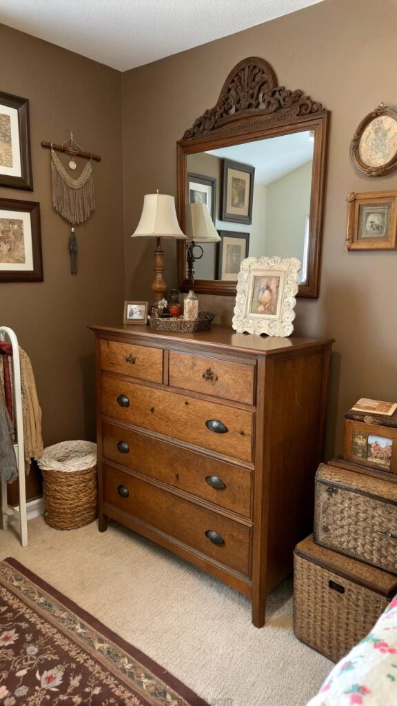 Incorporate vintage finds to add character and history to your brown bedroom. Antique dressers, nightstands, or decorative objects can be unique additions. These pieces tell a story.