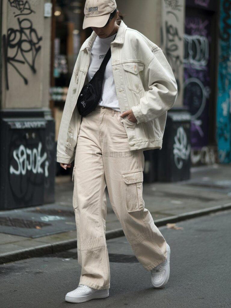 Pair your cargo pants with a plain white t-shirt and a denim jacket for a laid-back streetwear vibe. Add a pair of white sneakers to keep the look clean and comfortable. This outfit is perfect for running errands or hanging out with friends.