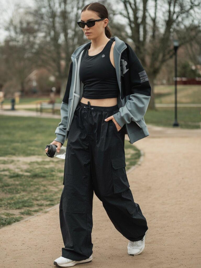 Choose cargo pants in a neutral color like black or olive green for a sleek appearance. Pair them with running shoes to enhance the sporty vibe. This outfit is all about comfort and style.