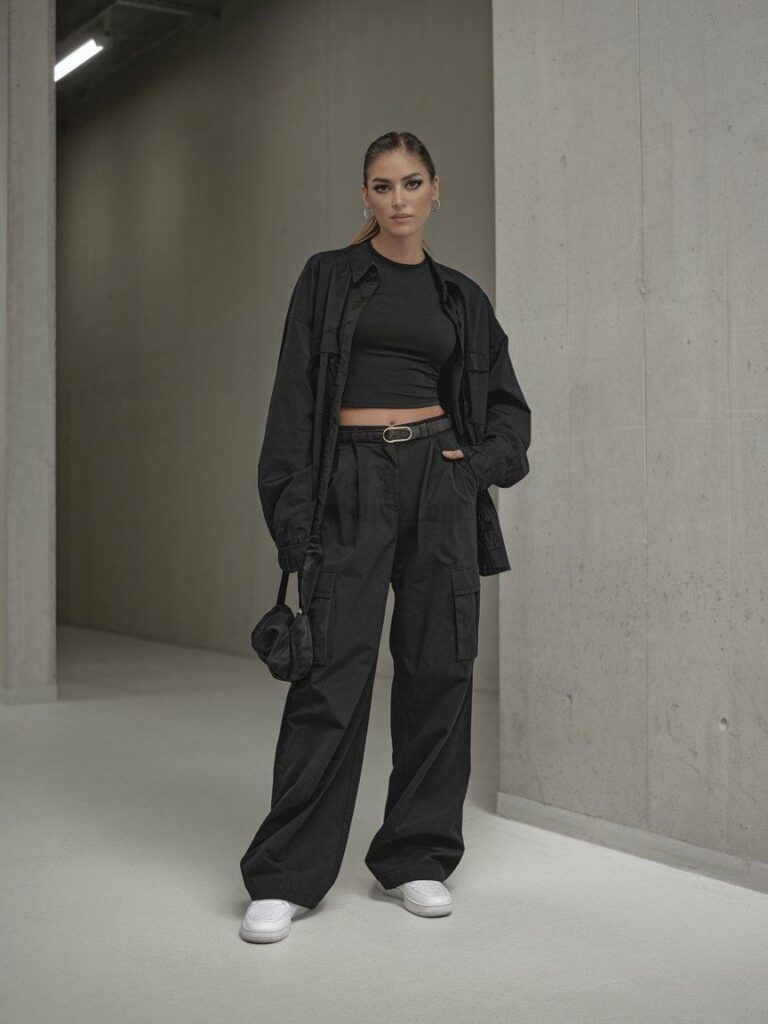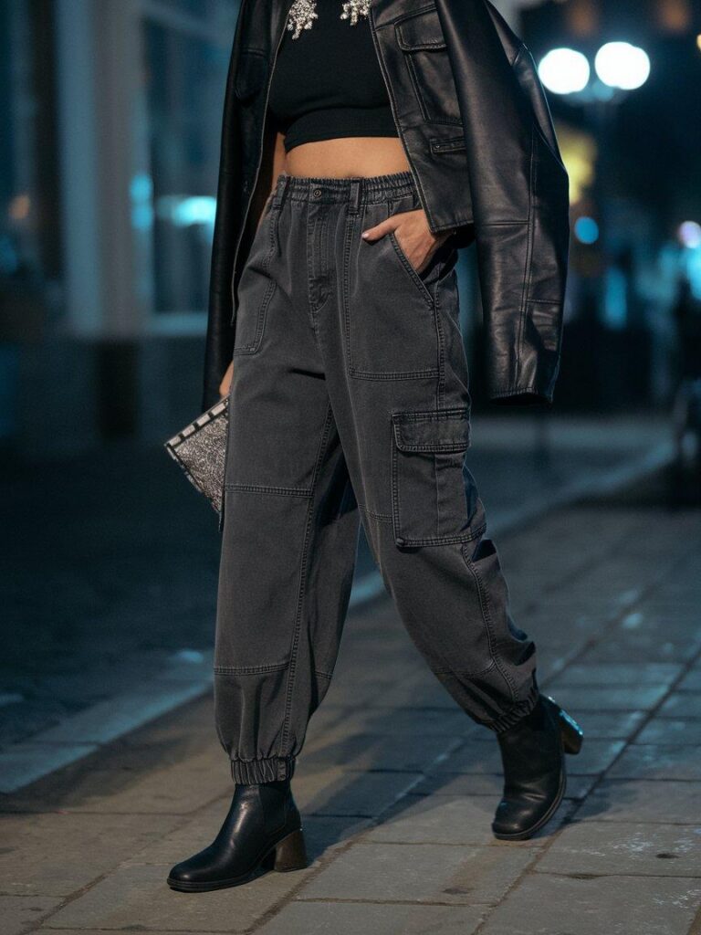 Choose cargo pants in a dark color like black or charcoal for a sleek appearance. Add combat boots or chunky heels to elevate the outfit. This ensemble is ideal for making a statement.