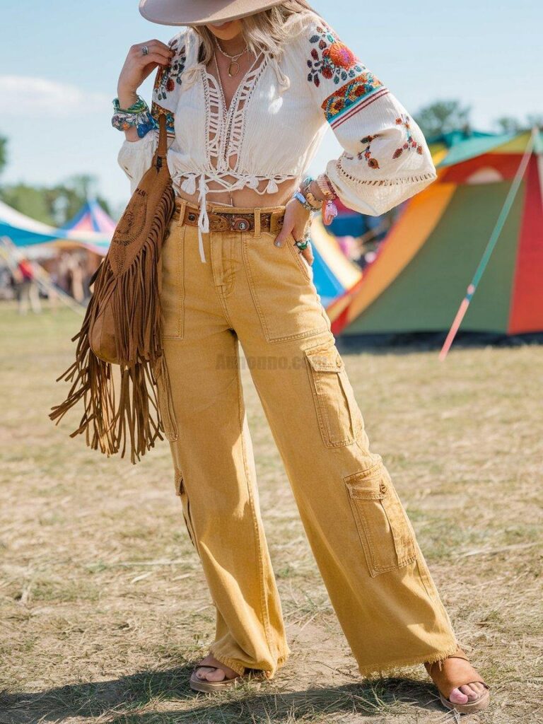 Choose cargo pants in a lightweight fabric and bright color like yellow or coral. Add a flowy boho top with intricate patterns for a festive vibe. You’ll feel free and comfortable in this outfit.
