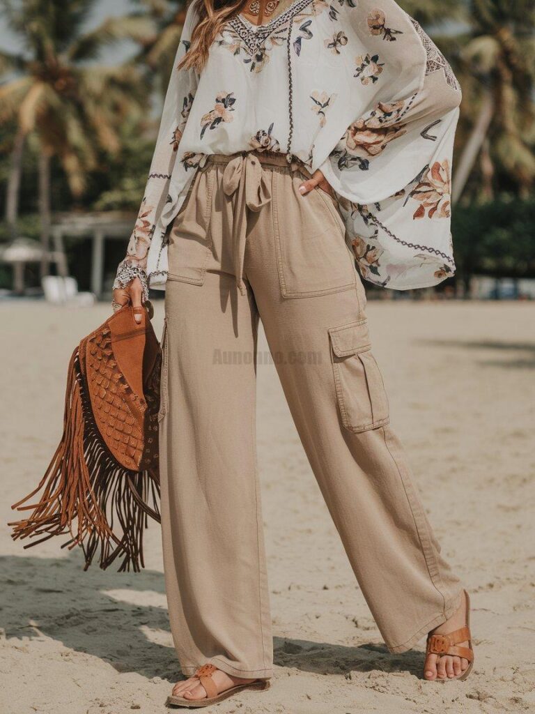 Choose cargo pants in a soft fabric and earthy tone like beige or brown. Add a flowy blouse with floral or paisley patterns for a boho vibe. You’ll feel free and comfortable in this outfit.