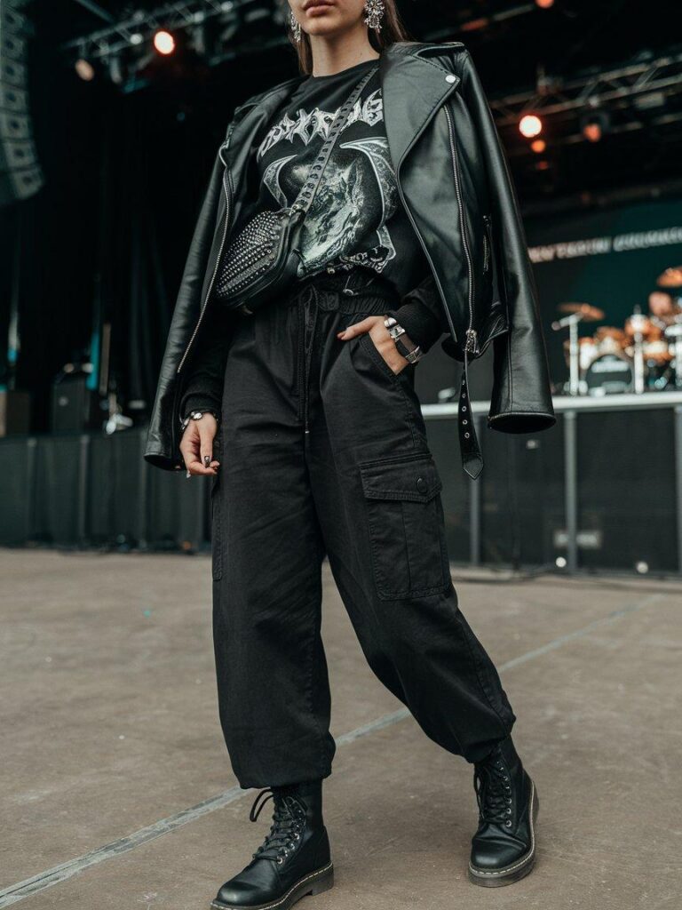 For an edgy rocker vibe, pair your cargo pants with a band tee and a leather jacket. This outfit is perfect for concerts or nights out. The combination is bold and confident.