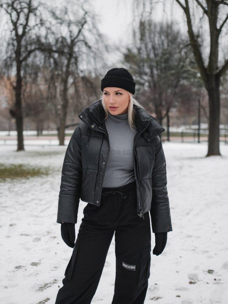 Choose cargo pants in a thick fabric and dark color like black or navy. Add a cozy turtleneck and a puffer jacket in a complementary color. You’ll stay warm while looking chic.