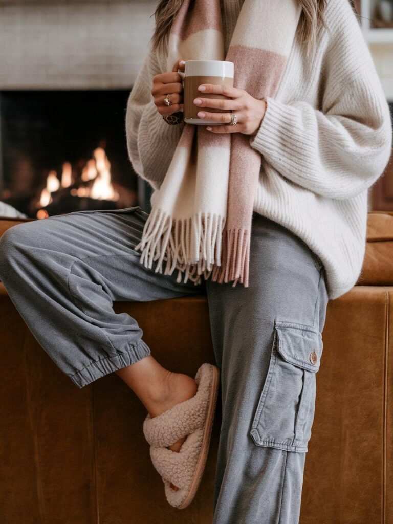 Accessorize with a soft blanket scarf and a mug of coffee to complete the look. This ensemble is ideal for a lazy day at home. It’s a great way to stay cozy while looking chic.
