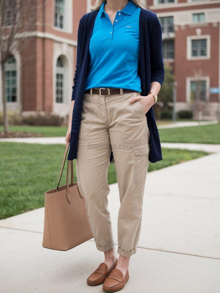 Choose cargo pants in a tailored fit and neutral color like khaki or navy. Add a polo shirt in a bright color and a cardigan for a layered look. You’ll look stylish and put-together.