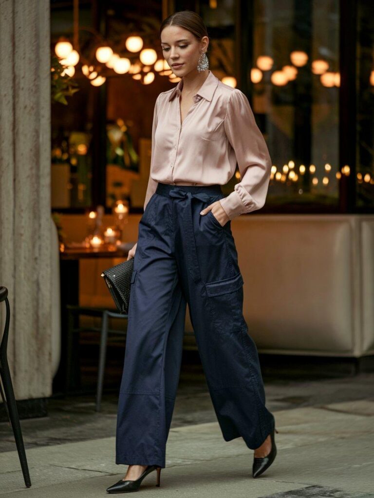 For a date night, pair your cargo pants with a silk blouse and heels. This outfit is elegant and stylish, perfect for a romantic evening. The combination is both sophisticated and comfortable.