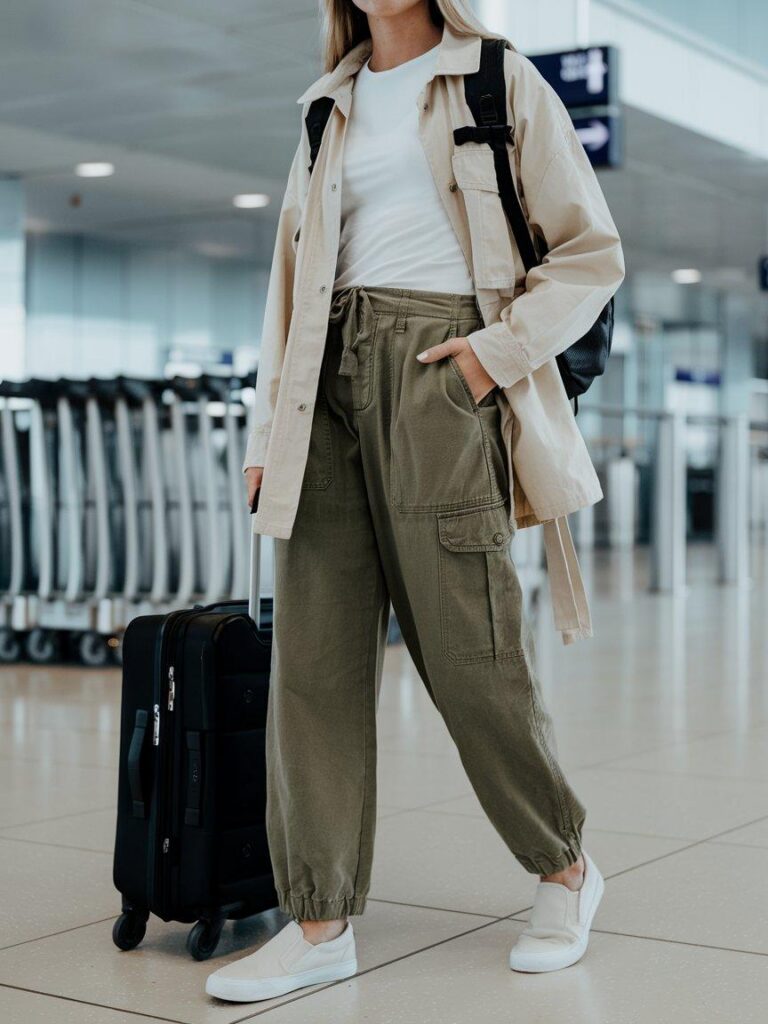 Choose cargo pants in a stretchy fabric and neutral color like olive or beige. Add a soft t-shirt and a utility jacket for a layered look. You’ll feel comfortable during your travels.