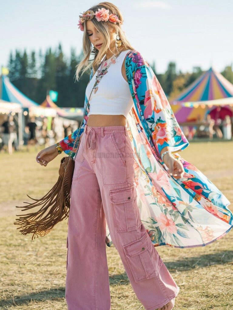 Choose cargo pants in a lightweight fabric and bright color like pink or orange. Add a crop top and a flowy kimono for a festive vibe. You’ll feel free and comfortable in this outfit.