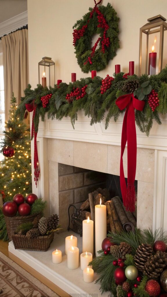 Arrange a collection of varying height candles along the mantle for a warm glow. Choose ivory or white candles to contrast with the vibrant red and green. Ensure candles are placed safely away from flammable decorations.