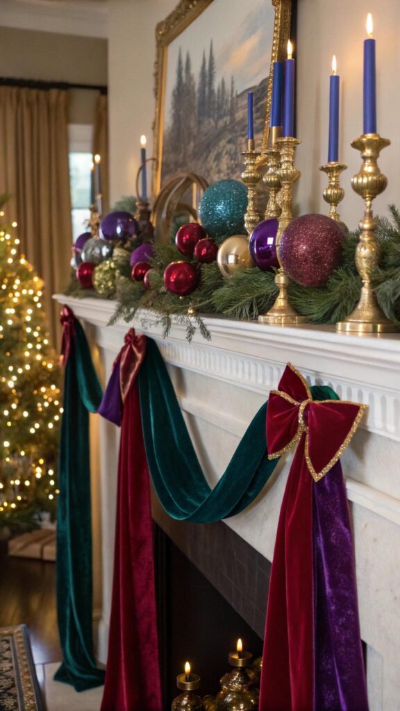 Adorn your mantle with rich jewel tones like emerald green, sapphire blue, ruby red, and amethyst purple. Use velvet ribbons, ornate ornaments, and metallic accents. This creates a luxurious and dramatic display.