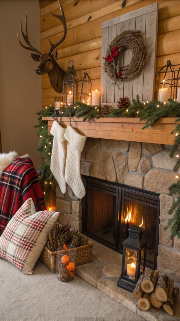 Transform your mantle into a cozy cabin retreat with warm, earthy tones and natural materials. Use plaid blankets, faux fur throws, and wooden accents. Incorporate elements like deer antlers or rustic lanterns.