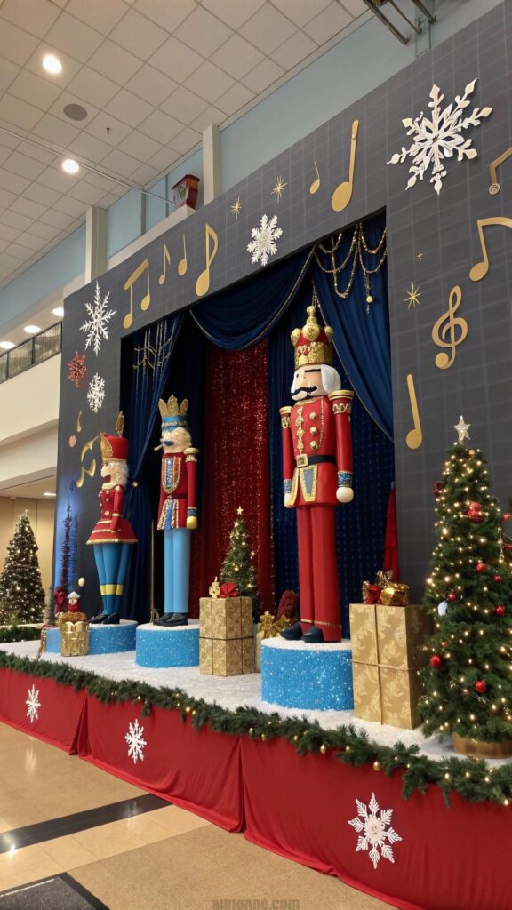 Drape garlands with musical notes or glittery snowflakes. Add small, ornate gift boxes and miniature Christmas trees. These details create a theatrical and festive display.