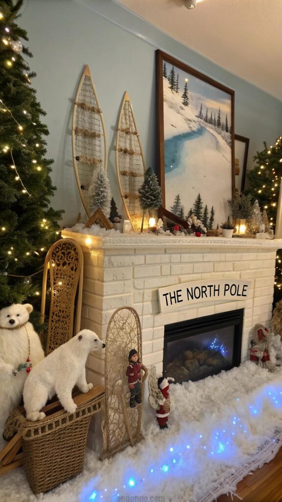 Embark on a North Pole expedition with your mantle decor. Use elements like miniature sleds, snowshoes, and vintage maps. Incorporate polar animals like penguins, polar bears, and arctic foxes.