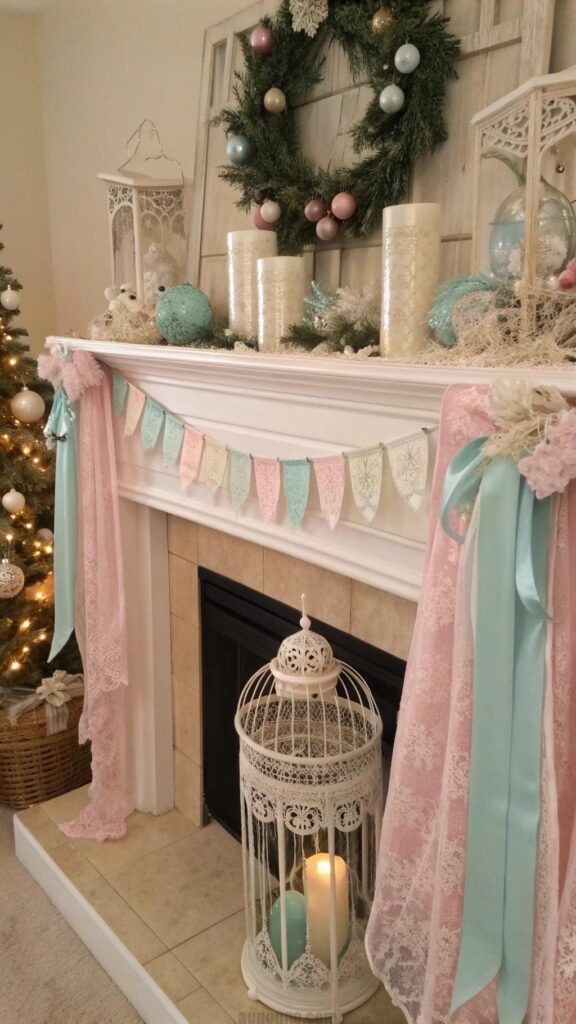 Create a soft and romantic shabby chic Christmas mantle. Use muted pastels like blush pink, mint green, and cream. Incorporate distressed finishes, lace, and vintage-inspired ornaments.