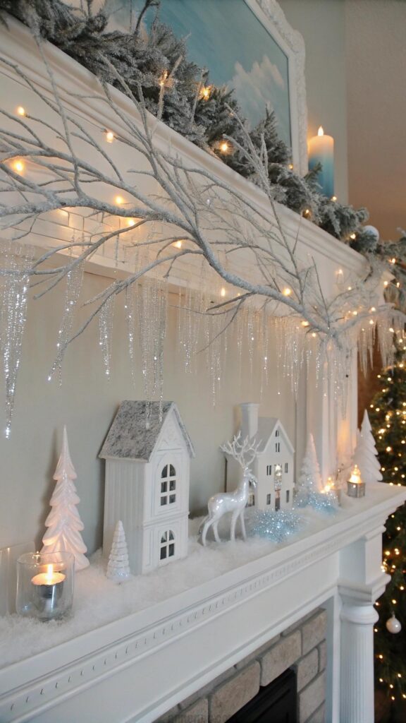 Place miniature white houses and artificial snow along the mantle. This creates a charming village scene. Add small silver reindeer figurines to complete the wintry tableau.