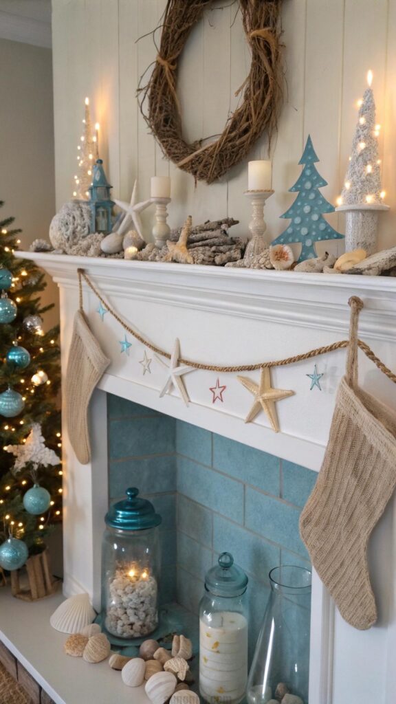 Transform your mantle into a serene coastal escape. Use shades of blue, white, and sandy beige. Incorporate elements like seashells, starfish, and driftwood for a beachy feel.