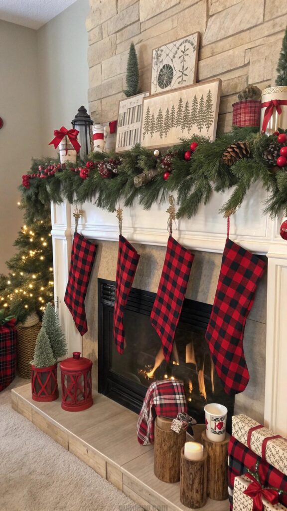Consider adding a thermos or mug filled with faux hot cocoa and marshmallows. This enhances the cozy, inviting atmosphere. The plaid and buffalo check theme brings a comforting, homey feel to your Christmas mantle.