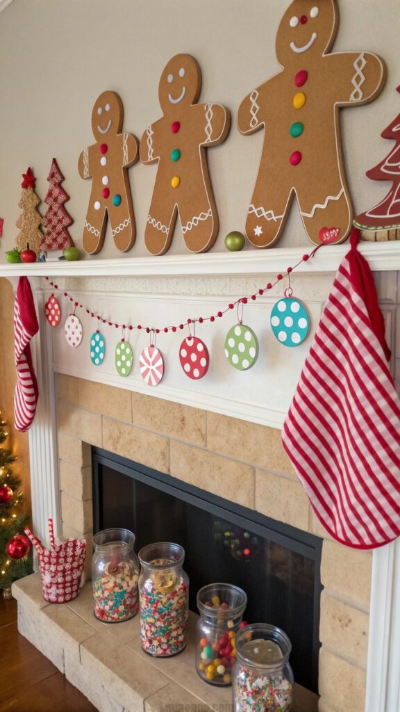 Celebrate the festive season with a gingerbread man themed mantle. Use gingerbread man cookies, cutouts, and figurines in various sizes. Incorporate red and white candy cane stripes and playful polka dots.