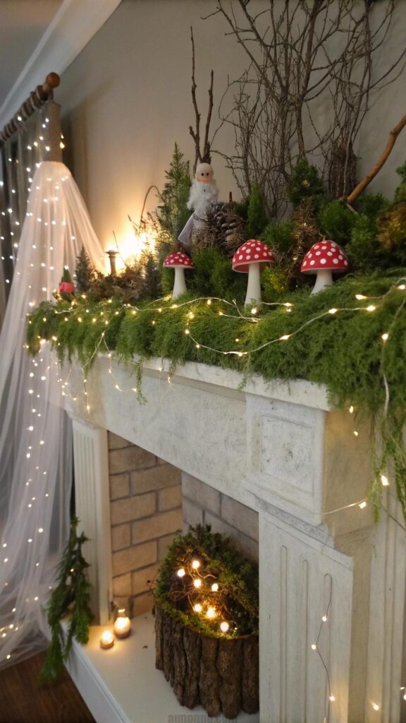 Create an enchanted forest fantasy on your mantle with mystical elements and soft lighting. Use moss, fairy lights, and delicate branches. Incorporate whimsical creatures like pixies or tiny glowing mushrooms.