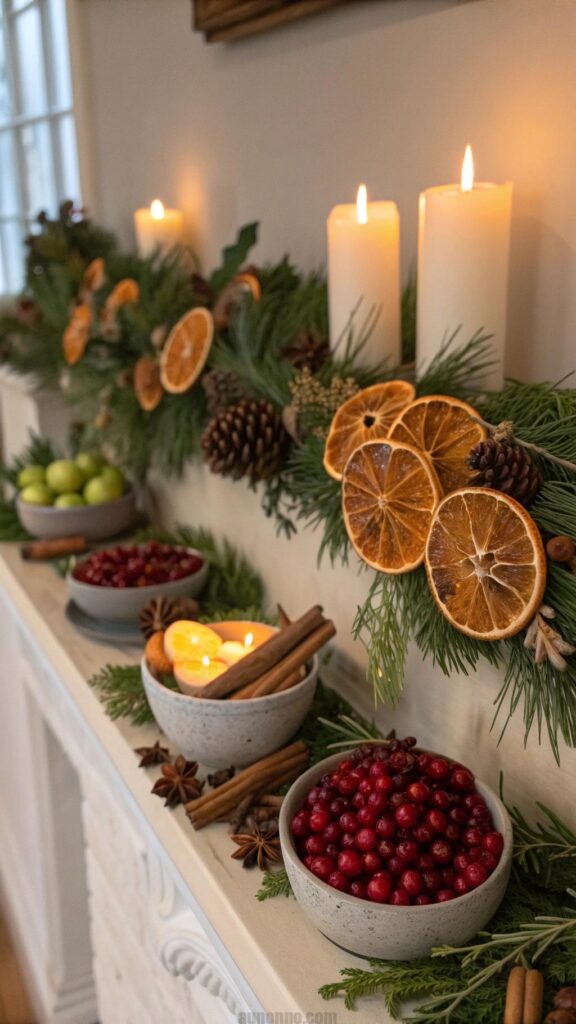 Display chunky knit stockings and simple pine garlands. Add small bundles of cinnamon sticks or dried orange slices for a comforting aroma. These details enhance the rustic charm.