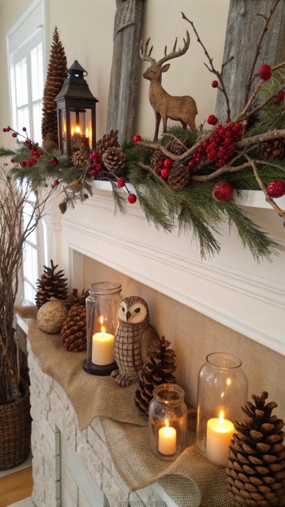 Bring the beauty of the forest indoors with a woodland-inspired mantle. Use natural elements like real pinecones, bare branches, and dried berries. Incorporate earthy tones such as browns, greens, and deep reds.