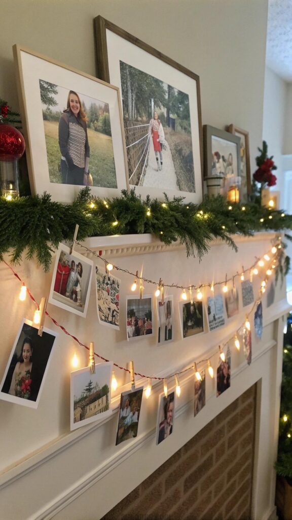 Make your Christmas mantle truly unique with a personalized photo display. Print out cherished family photos from past Christmases. Use small clothespins to attach them to a string of fairy lights or a thin garland.