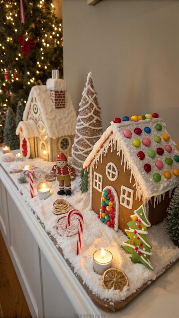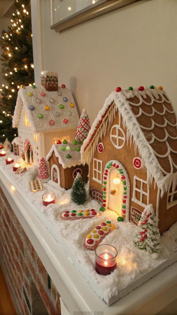 Build a delightful gingerbread house village on your mantle. Use various sizes of gingerbread houses, from small cottages to grand mansions. Decorate them with white icing and colorful candies for a festive look.