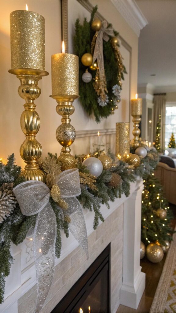 Elevate your Christmas mantle with a luxurious blend of gold and silver. Use metallic ornaments, glitter-dusted branches, and mirrored accents. This combination creates a sophisticated and opulent display.