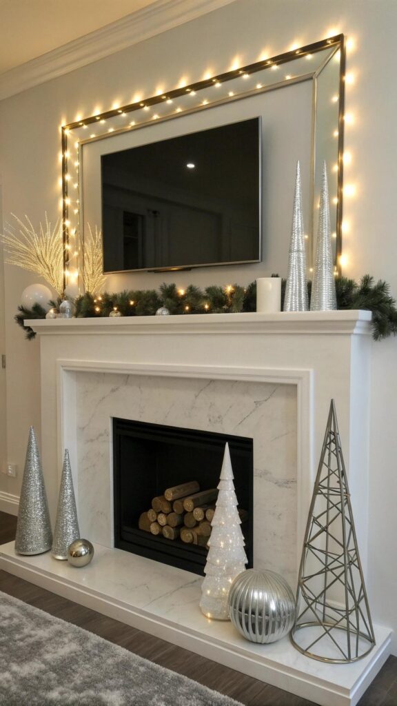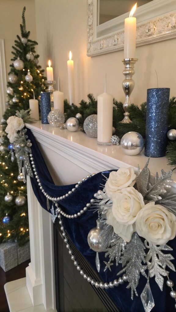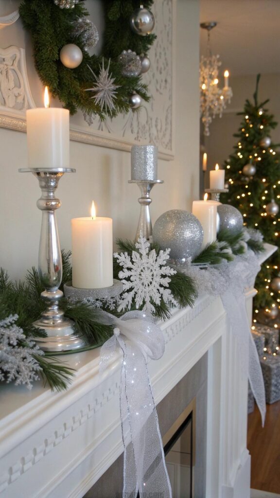 Design a sophisticated mantle with a clean silver and white palette. Use sparkling silver ornaments and crisp white garlands. This creates a serene and elegant winter display.