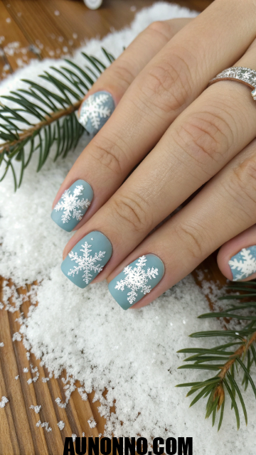 Snowflakes capture winter’s magic on your nails. You draw white flakes over a blue base. Silver lines make them pop.