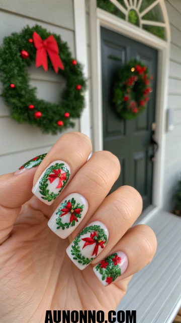 Wreaths circle your nails festively. You loop green vines with red berries. Bows center them.