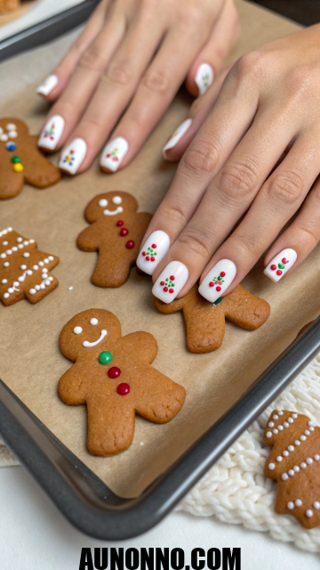 Gingerbread men create tasty nail art. You outline brown figures with white icing. Candy buttons decorate them.