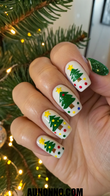 Christmas trees symbolize the season on nails. You paint green triangles with yellow stars. Colorful dots act as ornaments.