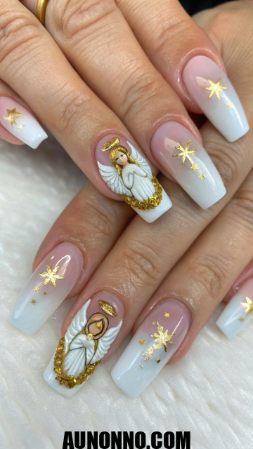 Angels float gracefully on nails. You paint white wings and halos. Gold outlines define.