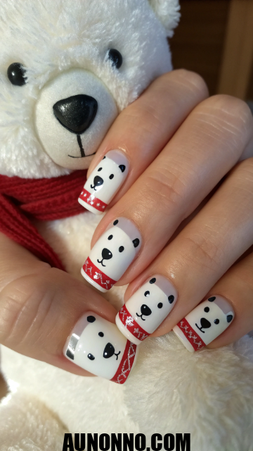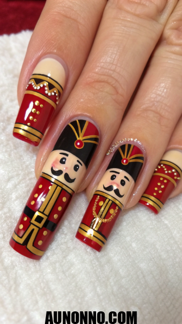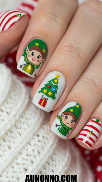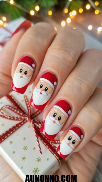 Santa’s jolly face brings smiles to your nails. You paint red hats and white beards. Black dots form the eyes.