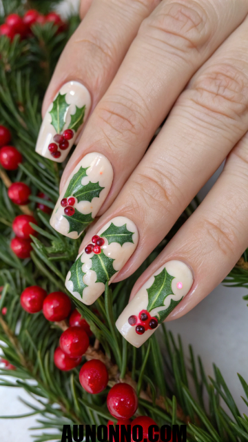Holly berries bring nature to your nails. You draw green leaves and red dots. Gold veins add elegance.
